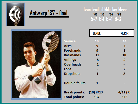 It was a third big ’87 final between the best Czechoslovaks of the 80s, each one in different conditions “the best of five”: Mecir won in straight sets on an outdoor hardcourt (Key Biscayne), Lendl took his revenge on clay (Hamburg) also in straights, and when they met under the roof in Belgium, finally there was a 4-setter with quite long uncertainty who would prevail because after more than two hours there was 4-all in the 3rd set – Lendl won five games in a row then, establishing his superiority. In the last game of the 3-hour 18-minute final, he struck two aces, and converted his third match point with a BH-volley winner. “This was a hard match. He was extremely tiring in the first set,” Lendl said. “I was not really feeling tired but I certainly was not as fresh as I wanted to be.” Indeed, it was a rare situation that Lendl was profusely sweating in the opening set due to Mecir’s resistance in baseline rallies, and got a time-violation warning (30 seconds at the time) which he couldn’t accept. Lendl, who earned a $215,000 check, also renewed his chance to add to his collection a second million-dollar Diamonds Trophy – a golden racquet inlaid with more than 1,600 diamonds.