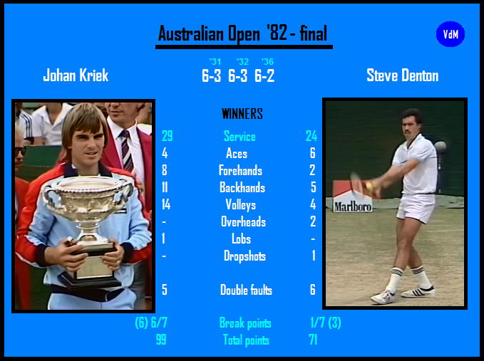 The same players in the Aussie Open final second year running, actually they played two finals the same year because the Aussie Open ’81 was concluded in January ’82 while the Aussie Open ’82 in December that year! Both escaped the semifinals trailing 3:5 in the fifth sets, but the marathons in the dazzling sun affected Denton [13] more (he had played one match more). His first serve was generally the only shot in his arsenal that made him feel superior to Kriek [12]; in the final that shot deserted him (especially when it mattered the most, as he was facing break points) and the match unfolded in a pretty straightforward fashion. From *2:3 (15/30) in the opener the Afrikaner – with a fresh American citizenship – was dominating in every aspect of tennis craftsmanship. The last two games were the longest (6 and 5 deuces respectively).