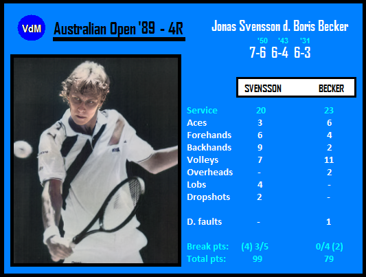 Svensson [21] reached two major semifinals (1988 and 1990 in Paris) while given his whole career he could be satisfied with just one, on the other hand he can think he should have reached three major semifinals because in Melbourne ’89 he eliminated in straight sets Becker [4] who enjoyed his best season then (the Wimbledon & US Open champion) and in the quarterfinals he faced Gunnarsson whom had easily defeated in their three previous meetings, yet in their clash in extreme heat, Svensson was almost destroyed (0-6, 3-6, 6-4, 4-6) trailing 2:4 in the 3rd set. The Australian Open ’89 was very specific, what could help Svensson against Becker could also harm him against the fellow Swede. The first week of the event was played in exceptionally low temperatures for Melbourne standards in January, and suddenly the weather dramatically improved as the fourth round kicked off; with each subsequent day the temperature was raising being almost unbearable in the last days of the month… Becker was visible frustrated with the heatwave, initially he was only trying to hold his serve (collected just two points in Svensson’s first six service games), but after losing the opener 5/7 he threw his racquet at 2-all (0/30) – it didn’t help, he was broken for the first time then. In the next game he wasted a 40/0 lead to break back. In the 3rd set he decided to attack the net behind each 1st serve, but it worked out briefly, and the Swede won four games in a row from *2:3 onwards.