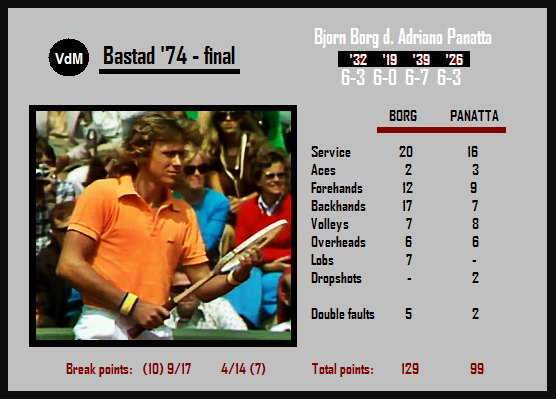 Adriano Panatta is the only man to beat Borg at the French Open. The Italian did it twice (!), the final in Bastad ’74 separated those two Borg’s defeats in Paris… In the 1st set, the 18-year-old Borg [8] saved a triple break point at 5:3 and it upset Panatta [26] very much – he lost 11 straight games in total (from *3:4 in 1st to 0:3* in 3rd). Borg was leading *6:5 (40/0) when the Italian saved the triple match point attacking the net on each occasion to win 12 out of 14 points. “This was a good victory,” said Borg, “but it will be more important to beat Panatta next week, in the Davis Cup tournament.” …Borg wins that DC rubber 6-4, 4-6, 9-7, 6-3. Ultimately their H2H is finished at 10-6 for the Swede. Apart from the multiple Slam champions, Panatta was toughest opponent for Borg along with Tanner.