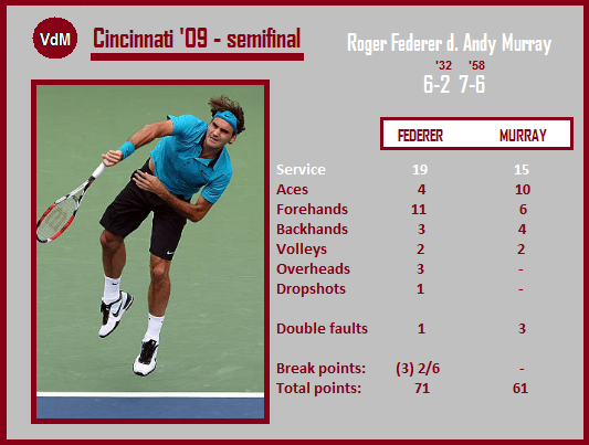 ☆ It was a time when it seemed Murray [2] would enjoy a better career than his peer Djokovic even though the Serb had already claimed his maiden Slam as opposed to the Scot. Murray had defeated Federer [1] four times in a row, three times in a row Djokovic, therefore many believed it was a matter of time he would become no. 1 in the world. I’m not sure which adjustments Federer made, but he raced to a promising start breaking at 2:1 and 5:2 having wasted a triple break point at 4:1. In the 2nd set Murray improved his serve, neither of players created a break point, and the tie-break progress refelcted the serve dominance, yet the beginning didn’t indicate it – Federer almost led 4:0 after a forehand passing-shot. Murray had two set points as a receiver, at 6:5 (service winner) and 8:7 (his good backhand passing-shot landed in the corridor). The Swiss won the breaker 10/8 after Murray’s double fault.