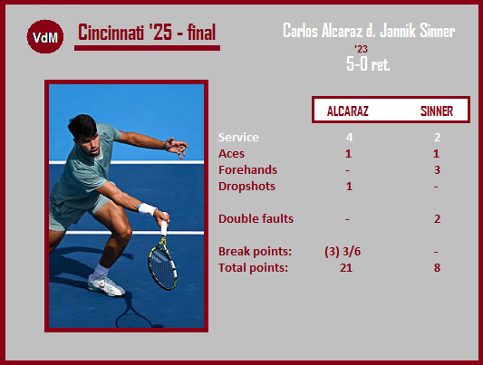 Cincinnati ’25: Alcaraz d. Sinner 5:0 ret. [illness]