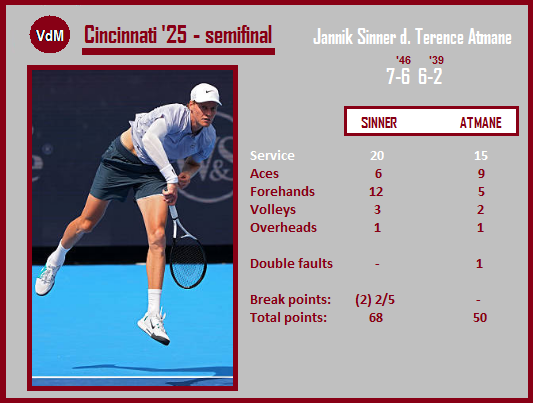 It’s a rarity that a player with such a small main-level experience as Atmane had, advances to the final stages of a big event. The 23-year-old Frenchman [136, qualifier] had just a 5-14 record at that level upon his arrival in Ohio, yet he managed to win five matches in Cincinnati’ main draw, eliminating two Top 10ers! And he played really well against the birthday-boy (Sinner just turned 24) in the opening set. He kept an excellent percentage of 1st serve in (78%) hitting the ball ferociously (with sporadic mixing of kick serves), but he began the tie-break committing the lone double fault, not risking his second serve. Sinner backed it up with two quick points and controlled to the end (7/4) obtaining the last point when Atmane’s return landed just beside the baseline. The best player in the world needed four deuces in the opening game of the 2nd set, and finally imposed his superiority breaking with ease at 2:1 and 5:2.
