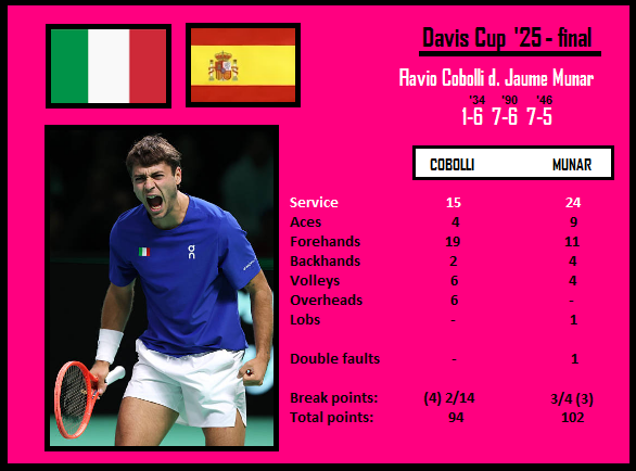Italy it’s a tennis powerhouse in the 20s; despite the absence of two best Italian players (Sinner & Musetti, who were exhausted after a demanding finish of the season), the Italians triumphed for the third straight time in the Davis Cup finals as the competition moved after six years from Spain to… Italy. The Spaniards were also deprived of their two top players (Alcaraz, Davidovich), but it’s tough to call ‘surprise’ their participation in the final given the quality of other teams which came to Bologna (only one Top 15 player, Zverev)… Cobolli [22] and Munar [36] enjoyed the best season of their careers, each of them knew that would win the most important match of their lives, the Spaniard was in a tougher position because his potential victory only prolonged Spanish chances in doubles. He won an amazing rally at 1:0* (30-all) manufacturing a rare shot (a defensive BH lob using one hand above his head jumping a bit) and it helped him to go into the zone. He led *1:0 (30/40) in the 2nd set when someone fainted in the stands, and the match was halted for nine minutes. After the break he wasn’t the same, but still good enough to put himself into a position of being close to win the match in two successive sets (3 and 4 points away respectively). In the semifinal, 23-year-old Cobolli survived even a longer match as he defeated Zizou Bergs 6-3, 6-7, 7-6 withstanding seven match points in the deciding 17/15 tie-break (the sixth longest deciding 3rd set tie-break in history).