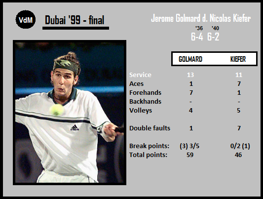 Golmard (lived 1973-2017; died due to motor neurone disease) was an average French player in the second half of the 90s, playing quite nonchalant Volkovesque tennis, drifting between Challengers and main-level events, but in 1999, aged 26, he underwent a metamorphosis. After claiming the title in Dubai where he defeated five higher ranked opponents, he reached two quarterfinals and two semifinals (Monte Carlo included), which elevated him from no. 63 to 22 within three months. The Top 20 seemed within his grasp in the second half of the season, but he didn’t play it at all because of knee injury; when he came back in January ’00 he won his second title (Chennai). In the years 2000-01 he remained dangerous, but far away from the consistent form of Spring 1999. For 22-year-old Kiefer, who poorly played in that Dubai final, it was a breakthrough tournament as well. Between Dubai ’99 and Dubai ’00 (he claimed the title, defeating Golmard in the quarterfinals) he was playing top tennis becoming one of the best players in the world on hardcourts. His quite impatient game-style causing modest results on clay didn’t allow to assume he’d become the best in the world at the Sampras/Agassi twilight era, but no-one could think that Kiefer would irreversibly lose his Top 10 position in 2000. It was very likely connected to the fact surfaces slowed down at the beginning of the 21st Century, and the best players adapted more defensive attitude.