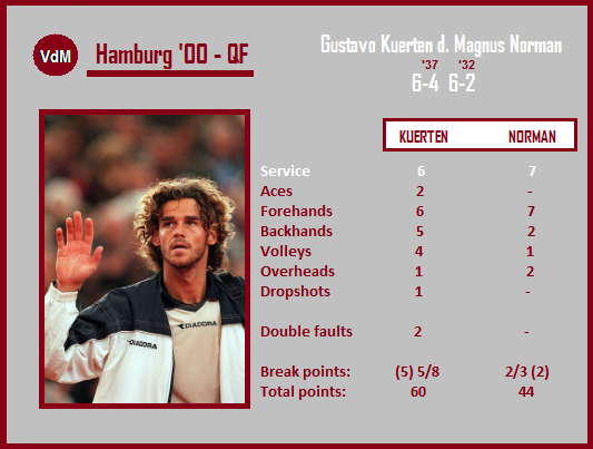 Indoor conditions, and an important match in hindsight between the two best clay-court players at the time. It was five days after their Roman final, and Kuerten took his revenge in a convincing style which certainly would help him a few weeks later during their Roland Garros final. Norman [4] started well in Hamburg, he led 2:0* (30/15), he also led with a break in the 2nd set (2:1) – then Kuerten [7] began to play in the zone, and the Swede was pretty helpless in five successive games.