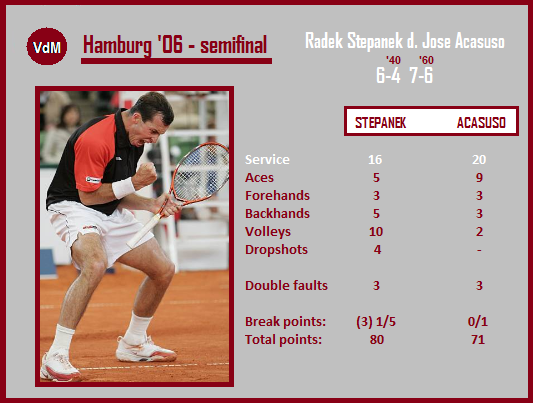 It was a great opportunity for both players to reach the biggest final of their careers (albeit Stepanek had played a match of this magnitude before with a positive outcome). Due to rain the semifinal must have been played under the roof which made it more intriguing because the lower ranked [30 vs 16] Acasuso was a more reliable clay-court player, but Stepanek was definitely better indoors which might have significantly helped him. It’s very rare that the opening game on clay is crucial, it was the case – Stepanek broke thanks to Acasuso’s errors, and went throughout the match being unbroken – Acasuso had his only BP chance leading 4:3 in the 2nd set; Stepanek survived a 16-stroke rally, the longest one and enjoyed it a lot (photo). In the tie-break there was 5-all when the Czech player got two straight points, and celebrated it on his back. It was their second & last main-level match (additional two in Challengers).