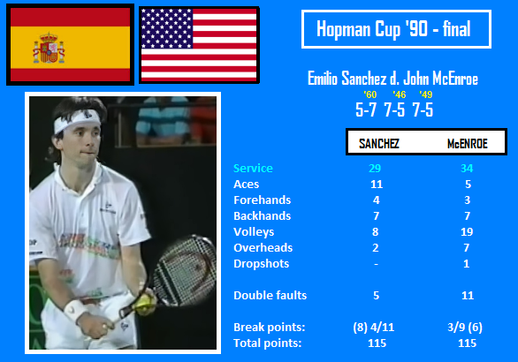 The second edition of the experimental team event, featuring competitors of both genders, taking place in an indoor arena on the west coast of Australia. McEnroe had defeated Sanchez 7-5, 3-6, 7-5 in their first meeting at the World Team Cup ’87, in Perth a similar match occurred but that time Sanchez dealt better with the finishing line. Actually McEnroe helped him to level at one set apiece. The American missed a backhand volley on mini-match point at 4:3 in the 2nd set from a position he was usually hitting winners. • In the 11th game he got the warning for a ball abuse, then facing a break point he got a point penalty for obscenity. Sanchez began the decider breaking with the help of three backhand passing-shot winners, but wasted a double break point at 2:0 and the things complicated for him at the end. He led 5:3* but nerves overwhelmed him, McEnroe couldn’t cope with them either, in the 11th game he was on the verge of another warning which would mean ‘game penalty’; ultimately the umpire was very tolerant, but McEnroe didn’t take advantage of it. In the last, longest game of the match, Sanchez wasted a match point, but withstood two break points and finished victorious… In the 90s, Sanchez lost five times in the fourth round at majors (a blow for a player at his level, who spent 6 years in the Top 20), twice being defeated by McEnroe in dramatic matches. McEnroe also won 2-1 their Davis Cup dead rubber in 1991, so five meetings between these two players, three in team competitions, and a deciding set was always required.