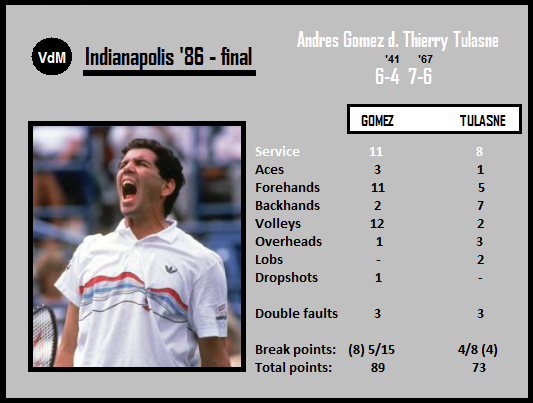 The two top seeds met in the final on green-clay in April, and just like in their previous meetings, the match was quite balanced, yet the three years younger Frenchman [16] was unable to win a set against the future French Open champion [18]. Tulasne led 4:2* in the opener, in the 2nd set there were six consecutive breaks between 2-all and 5-all, Gomez fought off a set point with a volley winner. At 6:5* he squandered a match point, but played a perfect tie-break, easily producing a sixtuple match point. Gomez earned $51,000, Tulasne a half of it. “He doesn’t have a big serve, and I felt confident throughout the match,” Gomez said after the final. “I felt once I got my game together I would be fine.” Gomez would also win in straight sets their next encounter, but finally Tulasne takes his revenge after six defeats in 1988 (Monte Carlo).