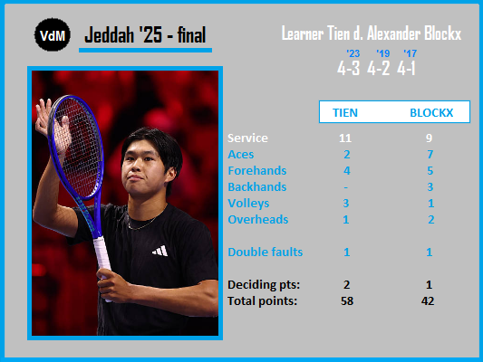 The two best “20-and-younger” players of 2025, who could participate in the NextGen ’25 edition, namely Mensik [19] and Fonseca [24] withdrew which is understandable – they’ve been fully incorporated into the main-level ecosystem for more than a year. Fonseca had won the title a year before so he had nothing to prove this time. Tien [28] – Michael Chang’s pupil – who had recently claimed his first ATP title, decided to participate, thus he was the main favorite to the title facing seven young men from the Challenger level. The highest ranked among them, Blockx [115] found his way to the final at an easier path than Tien, but in the final the difference between them was clear. The 20-year-old Belgian was amazingly serving in the first set, but lost it in a tie-break, and in the next two sets when the quality of his serve slightly decreased, Tien established his supremacy in baseline rallies – in this department he’s already much higher than his ATP ranking indicates.