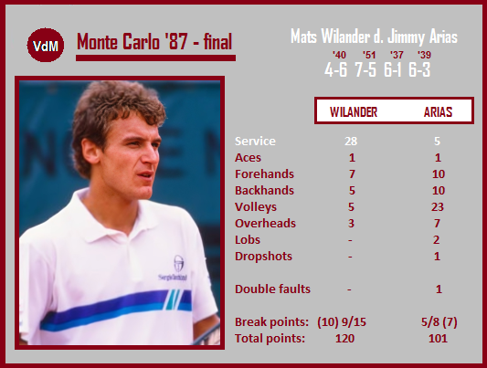 Wilander [5] and six days older Arias [53], two prodigies born in 1964, who had won their first professional matches as 16-year-old boys, therefore a great rivalry between them could have been anticipated pondering about the entire 80s, yet nothing like that happened because Arias sunk into mediocrity in the mid 80s. At Monte Carlo ’87 he somehow channelled his best tennis from his teenage years by reaching his first Grand Prix final in almost two years. In the 1st set of the final his performance initially looked mind-boggling as he broke in the opening game, and was producing winners all over the place (struck 21 in the 1st set!!, Wilander 2). The Swede, known as a brilliant tactician, accelerated his serves and returns which changed the complexion of the encounter. He already led 3:0* (30/0) in the 2nd set, from 5-all onwards his superiority was unquestionable. Arias had claimed 5 titles as a teenager, he didn’t add any in his 20s, losing seven consecutive finals, that biggest one in Monaco was the fourth in the streak.
