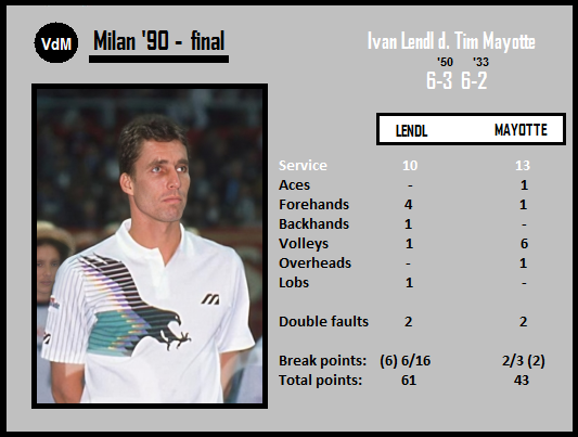 Lendl [1] and Mayotte [14] co-created the most one-sided H2H among players born in the 60s, Lendl never lost in their 17 meetings, the Milan final it was their match no. 16. Unfortunately Mayotte’s classical serve-and-volley game wasn’t sharp enough at the turn of the 80s and 90s when tennis made its transition to more aggressive shots (serves, passing-shots) thanks to improved equipment. During the years 1989-90 they played four matches against each other, and Mayotte was unable to win five games in any of nine sets they played. In Italy the Czechoslovak triumphed in 1 hour 23 minutes, one week later they’d play their last match, also a final, and Lendl was even more methodical in Toronto, punishing Mayotte’s delicate approach-shots, demolishing him 6-3, 6-0 in 64 minutes, breaking five times not dropping his serve once.
