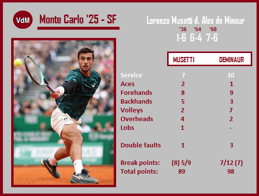 Monte Carlo (SF): Musetti d. De Minaur 1-6, 6-4, 7-6… 2 hours 38 minutes… Total points: 89-98… Unreturned serves: 9-11%