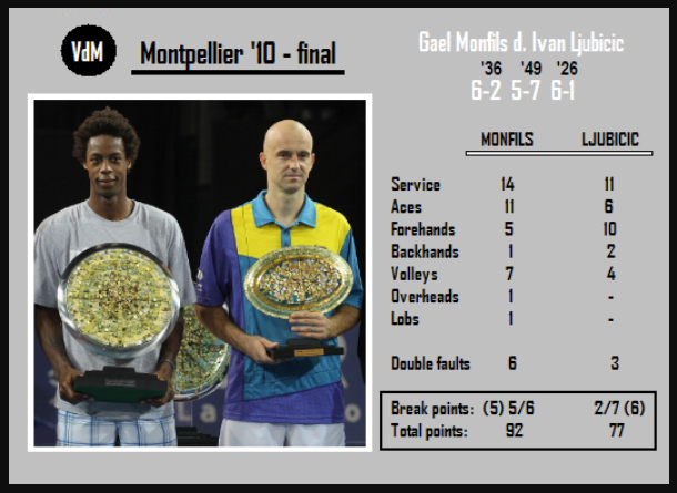 Monfils [15] saved break points in three different games of the opening set, and led *3:1 in the 2nd set, then at 5:4 he was three points away from the title. “I am so happy about this title, and it’s even more special because it is in France and in front of my crowd,” said Monfils, who improved his weak record in ATP finals to 3-9. “Today I was again very solid I think in my game, but also emotionally. I am extremely happy about the title, about my concentration throughout the week and about the level of my game. I feel I have been working on many things on and off the court and the results are now showing.” For the 31-year-old Ljubicic [17] it was the penultimate ATP final.