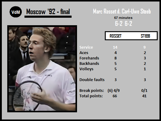 November 15, 1992 – there were two finals in European cities, and both ‘6-2, 6-2’ were won by very tall players, top servers, against left-handers utilising two-handed backhands; [46] Rosset’s final at the Kremlin Cup was 17 minutes shorter than Krajicek’s triumph in Antwerp. The Swiss giant failed to capitalise on four break points in Steeb’s first two service games, but afterwards Steeb [35] was pretty hopeless losing nine successive games. He finally created his first break point opportunity in the last game of the final which Rosset finished with two forehand winners down the line.