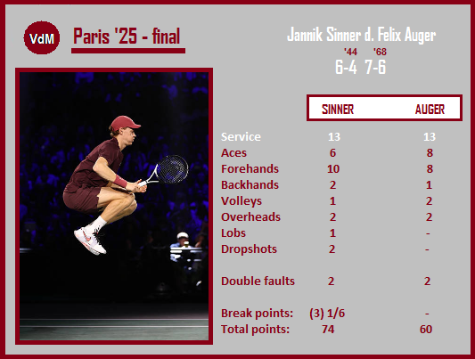The ATP indoor tennis in Paris has moved out after 39 editions from Bercy to La Défense Arena where the courts are very slow. Sinner [2] took part in three editions in Bercy, never being successful, but in the new venue he was almost the best version of himself (he didn’t look particularly well only in the 1st set of his third round match). In the final he won the toss, elected to receive, and broke in the opening game – it was the only break of the match. Auger [10] improved his backhand this season, but it’s still a weak shot comparing to Sinner’s backhand. The Canadian was patiently waiting for his chance, and it almost appeared as he led 5:4 (deuce) in the 2nd set – he had the ball on his forehand but sent his long. Also his forehand error decided about the ensuing tie-break – he missed a lot at 2-all after Sinner’s average return. On his first match point, the Italian constructed a baseline rally like a master, finishing it with a backhand down the line winner. “It’s huge, honestly, it was such an intense final, and we both knew what was on the line. I’m extremely happy, the past couple of months have been amazing. We try to work on things and seeing this result makes me incredibly happy. Another title this year… It’s been an amazing year regardless of what comes in Turin.” said Sinner after his second title within two weeks (previously Vienna where he lost one set) which allowed him to regain the pole position in the ATP ranking by a margin of 250 points over Alcaraz.