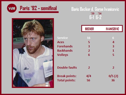 The top servers at the time, fast surface, it was natural to expect a tight encounter, especially that Ivanisevic [4] was in a terrific form having recently claimed indoor titles in Sydney & Stockholm, but playing second successive week day-by-day (he’d played four doubles matches along with eight in singles), simply tired him, and there was 1-6, *0:4 when he finally won two games on serve at ‘love’ which was so typical for him at the time indoors. He had his break point chances in the last game of the opener, and at 0:3 in the 2nd set. Becker [9], despite a perfect performance, missed a smash in the last game, standing at the net. Becker would lose just three games again on the same court in the semifinal three years later.