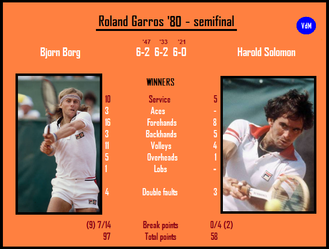 The fifteenth and last match between these two players. Initially in their rivalry the four years older Solomon was able to steal some sets (including a French Open ’74 semifinal), but from their eighth meeting onwards, he lost all sets, and only once got four games in a set. The beginning of their 1980 semifinal was quite promising that finally the shortest major semifinalist (168 cm) of the Open Era would be competitive. At 2-all he had a break point (Borg committed two double faults in a row that game), in the 6th game he won the best rally of the match (17 strokes) responding to [1] Borg’s four overheads before finishing it with a tight backhand passing-shot! Solomon [6] received an ovation from the crowd, but running a few meters behind the baseline from corner to corner exhausted him (in the quarterfinal he’d survived a 3.5 hour match against Vilas). For the next twenty minutes, Solomon was still trying his best, but he was no threat for Borg from 2-all in the 2nd set onwards – the Swede collected ten straight games, not facing any game/break point, attacking the net often and convincingly finishing the points with winners. Borg and Solomon had the best two-handed backhands at the time, and the match was almost deprived of slice shots – a super rarity at the time.