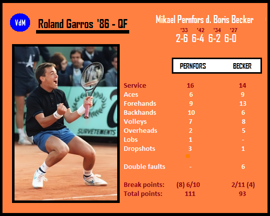 Approximately for an hour it seemed impossible Pernfors [27] would win that match. Becker [3] was dominating the majority of rallies under a gloomy sky (17°C). He didn’t convert a triple break point at 2-all in the 2nd set though, and from 4-all to the end of the match the spectators were rubbing their eyes in astonishment when they saw that 17 cm shoerter Pernfors was not inferior to Becker in terms of service. The West German lost his patience in baseline exchanges, but when he was attacking the net, Pernfors was perfect in execution of passing-shots (down the line and cross-court). It meant 14 out of the last 16 games for the Swede, whose ranking was too low to allow him participating in the French Open a year before. “When he was out of court and had just one chance to pass me, he passed me,” 19-year-old Becker admitted. “He never played a wrong ball.” That ’85 year when Pernfors was ranked no. 325, he almost defeated Becker in the Indianapolis second round which worked as a confidence boost reflected in a sensational 1986 season when Pernfors turned from an unknown player to No. 11 in the world.