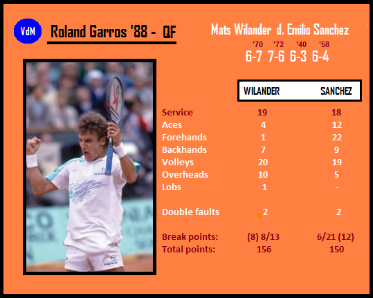 Serve & volley: Wilander 16/25, Sanchez 4/14