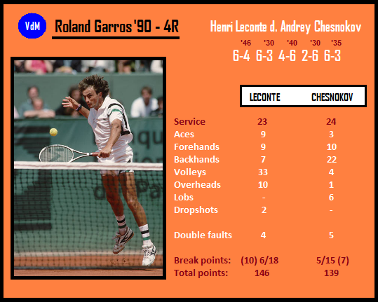 It was really staggering that Leconte [33] wasn’t broken in the first two sets on Centre Court because he was constantly attacking the net behind each serve against the player [10] who had arguably the best two-handed backhand at the time. Leconte had only one tough game on serve as he trailed 2:3 in the opener (saved four break points). The amazing streak was finished as the 3rd set kicked off, Chesnokov finally began to pass the Frenchman on a regular basis and broke him three times in that set, winning five games in total (from *3:4 to 2:0* in the 4th set). The Russian – still representing the Soviet Union – easily grabbed the 4th set, but Leconte accumulated his energy which allowed him to play a nearly perfect deciding set – he missed a BH volley from a winnable position returning at 1:0, 40/0 and lost that game – apart from that he was actually flawless, and from 3-all onwards he won the last three games dropping one point each game. In the decider 16 out of 29 points he won with winners (1 ace, 1 BH, 10 volleys, 4 overheads) which means an astonishing 55% of points won thanks to winners, there were 60 winners in total by him (41% for the entire contest)… French Open ’90 marked the only Slam when Chesnokov was considered a favorite to the title – he had played a semifinal a year before in Paris, and in the events leading to the French Open ’90, he was in a tremendous form having won 16 out of 17 matches while the fourth round against Leconte he entered not dropping a set in his first three rounds. Common sense would suggest that Chenokov could have defeated Leconte in their clay-court matches while Leconte could have taken his revenge on faster surfaces – nothing could be further from the truth, Leconte won all their 8 official meetings (nine including ECC-Antwerp ’90), seven on clay, thrice not even losing a set! Chesnokov wasn’t the fastest player while Leconte possessed an amazing acceleration off both wings which permitted him to put pressure on Chesnokov in the service games of the Russian, attacking him at any given moment. Another thing it’s leftness, Chesnokov never defeated the best left-handers of the 80s Connors & McEnroe, he had a losing record against big-serving lefties like Forget & Ivanisevic.