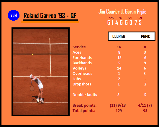 ☆ Goran Prpić was projected to play the French Open quarterfinal in 1991 (at least the 4th round) as a Top 5 player on clay that season before the Parisian Slam, but lost to Mancini in five sets of the round two. Two years later Prpić’s advancement to the quarterfinals was absolutely unexpected because his clay-court record leading to Paris was just 1-5 (an impressive 21-9 in 1991). Despite his very low ranking he could have played without qualifying rounds because a month before he had been no. 80 when lost many points in Monte Carlo (the semifinal a year before). That match against Courier it was “swan song” of the Croat, soon afterwards he’d disappear from the main-level struggling with his right knee that bothered him throughout his career forcing to play under painkillers (he was wearing a knee brace since February 1986 when he suffered a severe injury during a Boca West match against Krickstein; that injury sidelined him for more than two years).