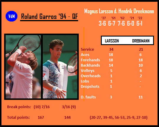 French Open 1994 (QF): Larsson d. Dreekmann 3-6, 6-7, 7-6, 6-0, 6-1… 3 hours 3 minutes… Total points: 167-144… Breaks: 7-3