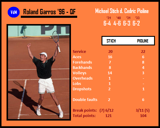The last match won by constant net-rushing at Roland Garros in the crucial stage of the event. Stich [16] was very intelligently applying the serve-and-volley strategy throughout the 2.5 hour contest. He avoided a clear pattern, and kept Pioline [19] guessing whether he would be at the net behind his first or second serve, occasionally after first or second ground-stroke. The Frenchman was dealing with it well for one and a half hours. He created a triple break point in the 1st game of the 3rd set, then Stich began to play in the zone – it lasted an hour approximately; he fired a half of his aces in that set (including six in two quick games, 3 each). Pioline seemed a bit disoriented in the 4th set when Stich added backhand dropshots to his game-plan. There was 4:0* when the German didn’t need to be interested in breaking another time. On his first match point he attacked the net behind his second serve, Pioline’s BH return landed in the net. Admittedly Stich was still very offensive in the semifinal vs Rosset, but that match he had under control from start to finish, and used the serve-and-volley strategy only as an element of surprise. Stich and Pioline would meet in a major match one year later, in the Wimbledon semifinal, and Pioline takes his revenge in something what eventually meant Stich’s ultimate appearance at the pro level.