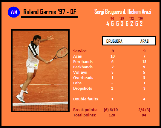 [19] Bruguera led *3:1 (30/15) when decided to play a serve-and-volley action which was very rare for him on clay, he lost the point being passed, and the set (from 4:3), but Arazi [55] – a great shot-maker – was known as someone who was struggling to beat higher ranked players in back-to-back matches (in the fourth round he’d eliminated Rios 6-2, 6-1, 5-7, 7-6). The Moroccan couldn’t hold when the 2nd set started, and his ability to surprise Bruguera with brilliant ground-strokes; he didn’t possess the required stamina to keep the same level for three hours against the rock-solid Spaniard. Over the last three sets Bruguera had a problem to hold only leading 4:1 in the 4th set, there was 15/40, but two good serves gave him two quick points.