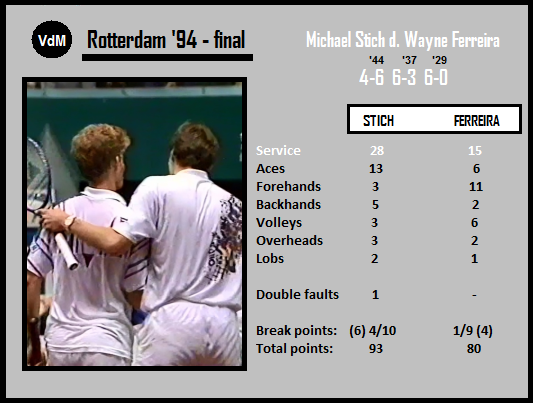 Between December ’92 and February ’94, Stich [4] was the best indoor player in the world. During that period of time he won six ATP titles under the roof (five on carpet, one on hardcourt… and led Germany to the Davis Cup triumph on clay). In order to do that he needed many tie-breaks, but in Rotterdam not only his serve and volleys were working perfectly well, he was also hitting his ground-strokes with tremendous conviction, breaking his opponents many times. In the final against Ferreira [17], there were deuces in the opening first four games, Ferreira emerged 3:1* thanks to super precise forehand passing-shots. The Afrikaner had won 17 points on serve, but trailing 2:3 in the 2nd set he was forced to save four break points. From 3-all onwards, Stich collected nine successive games, Ferreira didn’t play badly, simply Stich was winning all the most important points, and served out the championship at ‘love’ with 3 aces in a row. When Stich played indoor European tournaments again, in fall of 1994, he was a mere shadow of his former self from those 15 months mentioned above and shockingly didn’t qualify to “Masters” to defend his title – something that defied logic because in September ’94 he was ranked No. 2 with five indoor events ahead…
