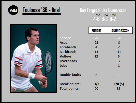 Forget – the golden child of French tennis – he’d been recognised as a big talent/potential major champion at the age of 17 reaching the third round of Roland Garros ’82, but he was struggling with injures and waited four years for his maiden title. Toulouse it’s a symbolic city for the Forget saga – three generations enjoyed successes there in twenty-year intervals (!); during the amateurish times Paul Forget (Guy’s grandfather) triumphed there in 1946 and his son Pierre did the same in 1966 when Guy was one-year-old. In the ’86 final Forget [39] was broken in his opening game, but afterwards his service disposal anticipated the years 1990-91 when he’d be considered as the best server in the world. He was mixing the pace with flat serves and slice serves, striking 8-7-6 aces in successive sets, unusual consistency in the mid 80s. Without other shots he wouldn’t break Gunnarsson [64] three times though. The Frenchman showed special skills in the decider, breaking in the first game with a complex rally, at 4:2 he got another break with a powerful backhanf down the line, probably his fastest ground-stroke on that day. “It was fabulous to win but I have to admit I was nervous on that last point,” said Forget, who won $30,000. “I think it was the first time since I won the French junior championships when I was 14 that I was so nervous over one point.”