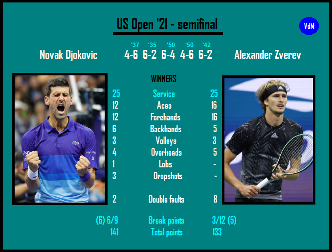 Serve & volley: Djokovic 3/4, Zverev 1/2