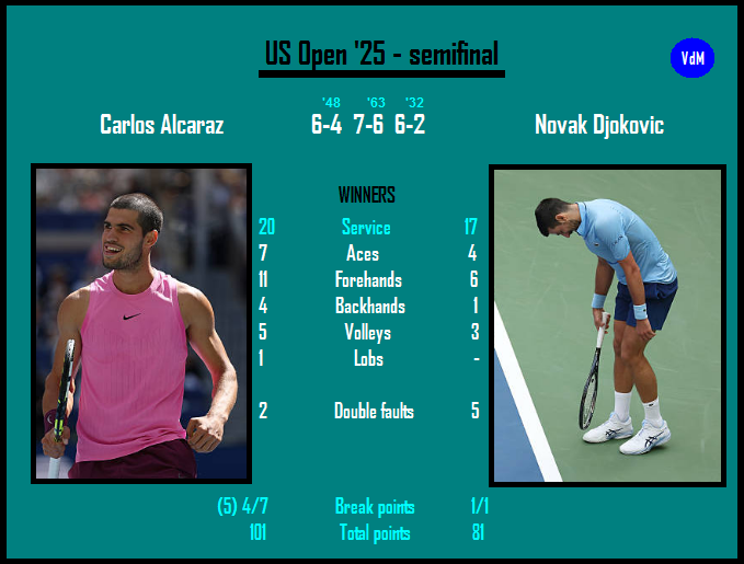 Djokovic [7] has become the first man in the Open Era to play four major semifinals in a year, losing them all. This is his harsh reality at the age of 38 – it’s recently almost impossible to advance to the major final not facing either Sinner or Alcaraz in the quarter- or semifinal. Djokovic had defeated Alcaraz in the quarterfinal in Australia this year, but that victory cost him so much, he retired after the opening set of the semifinal. The fact he had a two-day off before their meeting in New York City was beneficial, as opposed to weather conditions in the day-time when they played (26°C, ~70% humidity) – in five matches he’d won en route to the semifinal, physically the worst he looked in the only one he played under the Sun (2R vs Svajda)… Alcaraz [2] broke already in the opening game, and held five times firmly, not doing anything spectacular to get the second break. The Serb raced to a 3:0* lead in the 2nd set, but at 3:1 (30-all) Alcaraz showed his magic being able to make a FH passing-shot winner with a very short back-swing standing in no-man’s land. He broke back, and nothing interesting happened afterwards for ~thirty minutes. The tie-break was begun with Djokovic’s serve-and-volley action – he lost the point and it set the tone for the rest of it. He was constantly on the back foot, finally showed the first signs of tiredness as he lost a point for *3:5 (photo in the pic-stats). After the 4/7 lost tie-break, he seemed discouraged which is absolutely understandable given the fact he was facing the opponent 16 years his junior, who’s looking fresh as a daisy not having lost a set prior to the semifinal.