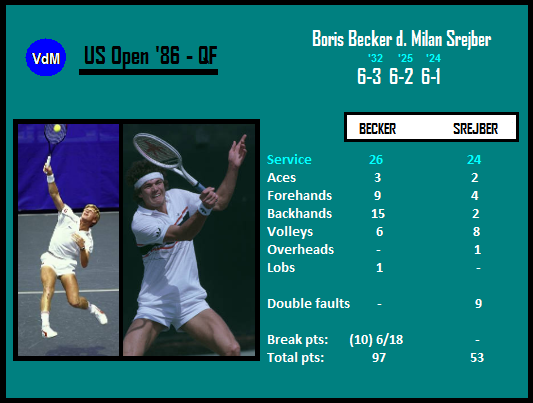 Srejber [37] began this match optimistically, he led 40/0 after three unreturned serves, but held after one deuce and it was the beginning of a disastrous night for him with a constant noise of air-planes over the main stadium in New York City. Srejber’s return games were catastrophic, his volleys not much better while Becker enjoyed a very good evening as far as his backhands are concerned, and after 1 hour and 21 minutes the match was concluded with a service winner. Becker [3] dropped two points on serve in two games of the 3rd set (he went through over two sets winning all service games with extreme ease), which made some exitement in the crowd; first after Srejber’s best forehands, then after his best backhands of the contest. There was a stretch across 2nd and 3rd sets, when Srejber got only one point in his four successive service games! He needed to save three match points to avoid a bagel set in the end. It was rather surprising that the Czechoslovak was beaten so severely because earlier that year he had defeated Becker 7-6, 6-3 at Boca West (also hardcourt outdoors) withstanding two set points in the opener, being broken just once; in the US Open quarterfinal he lost his serve twice each set.