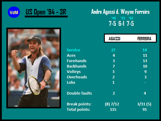 Serve & volley: Agassi 1/1, Ferreira 11/19