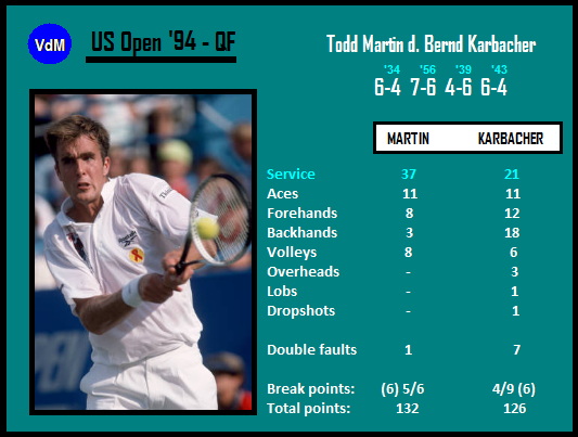 Karbacher [41] had quickly won the opening two games, and afterwards he was awful for nearly 50 minutes, not being able to cope with the strong wind. Martin led 6-4, 3:0* (15/0) while Karbacher was keeping his serve at ridiculously low 20% in (finished at 45%), five double faults were counted for him. The German held though with three successive winners when the ball landed on the lines, and suddenly he was a different player from that game to the end of the match, usually outplaying his opponent in baseline exchanges. Especially the tie-break was intriguing and could have shifted the momentum because at the time, after 3/4 of the season, ☆ Karbacher had the best TB record on tour (Martin didn’t play tie-breaks bad either in 1994), but he was serving a bit worse than the American, and lost that tie-break 5/7. The only break of the 3rd set occurred as Karbacher led 5:4. In the 4th set Martin [9], not showing any emotions throughout that quarterfinal, led 4:2, Karbacher levelled at four games apiece. In the 9th game, Karbacher played two forehands so close to the same sideline that in both cases there would have been winners, it was still more than a decade before “challenges”, Karbacher’s strokes were called out, and he was broken at 30. Martin finished the 2-hour 52-minute contest with a forehand winner. Their next two matches wins Karbacher. Thanks to his first major quarterfinal, Karbacher was elected by Niki Pilic for the Davis Cup semifinal against Russia in Hamburg where he lost in four sets to Kafelnikov.