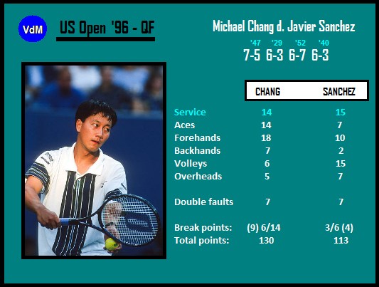 In the years 1995-97 when Chang [3] was playing his best tennis, being ranked higher he was winning major quarterfinals 3-0 regardless of opponent’s level; the same was applied either against players nearly at his level (Medvedev in Australia ’95, Rios in Australia ’97) or against much inferior (Voinea in France ’95, Tillstrom in Australia ’96). His quarterfinal against the younger Sanchez brother seemed like another routine 3-0 victory. Admittedly Sanchez [67] led 5:3* (deuce) in the opener, but at 5:4 he committed two double faults and lost seven games in a row in total. In the 3rd set he trailed 0:3* but proposing a wide variety of backhand strokes (after the bounce and in the air) he forced Chang to running from corner to corner and it paid dividends. He came back from a double break deficit, and took the breaker 7/2. In the 4th set Chang put big pressure again, created break points in three games and one break was enough to guarantee him the expected semifinal berth. Sanchez had defeated higher ranked opponents in 3rd (Stoltenberg) and 4th round (Boetsch). Against Stoltenberg, the Spaniard withstood four match points prevailing 8/6 in the deciding 5th set tie-break.