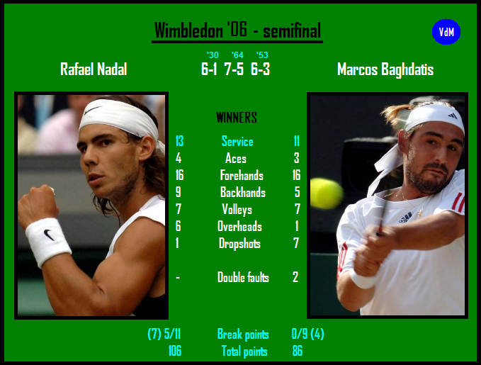 Baghdatis [16] couldn’t produce an unreturned serve in his first 24 points on serve, there was a quite shocking 1-6, *0:1 (0/40) score because he seemed like a player more naturally suited to grass than Nadal; he held from a triple BP down, and significantly improved from that moment. Nadal [2] – playing his first Wimbledon semifinal – had to give his all to get breaks at 6:5 in 2nd, and 2:1 in 3rd set (that break he obtained showcasing acrobatic athleticism at the net). The Cypriot should have won a point which would have guaranteed him breaking back (four break points in total at 2:4), but his shot, which caused Nadal’s error, was called ‘out’ – the Hawk-Eye system had had its debut at Miami 2006, but appeared at Wimbledon for the first time in 2007 thus complaints of Baghdatis couldn’t change anything. The Spaniard finished the contest with an overhead to emphasise his great performance at the net throughout the day.