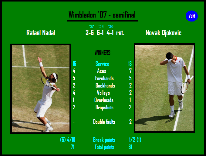 [5] Djokovic’s Wimbledon route from the third round to the semifinal was extraordinary: against very good grass-court players he won two four-setters and a five-setter, playing three tie-breaks on each occasion. The 20-year-old Serb was fully aware that another marathon facing a fitter opponent would be impossible, hence he entered court no. 1 with a clear idea of hitting his 1st and 2nd serves faster than usual, the same applying to his ground-strokes to avoid any longer rallies. It was working for 50 minutes more or less. After he dropped his serve at the beginning of the 2nd set (Nadal’s smash which pumped him up) it looked like he was feeling pain in his whole body after each stroke. Being broken for the second time in the 3rd set, he took a medical time-out, and after a consultation with the trainer, he decided to retire – it was his second retirement against Nadal [2] in their sixth meeting.