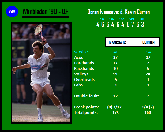 The decade of the 90s featured countless encounters (outside clay) dominated by big serves from both sides of the net when the receiver could only hope that at a critical moment his opponent would commit a double fault or made an error being close at the net. One of the first matches of this kind occurred in the Wimbledon ’90 quarterfinal when the arguably best server of the 80s (Curren) faced a player (Ivanisevic) who would be considered by many as the best server of the 90s. At 5:4* (0/30) in the opener, Curren [56] played a bit beyond his abilities passing the 13 years younger opponent with a cross-court backhand making a sudden turn of his torso being lobbed, and broke Ivanisevic’s serve with another passing-shot a few points later, that time off his forehand side. Ivanisevic [38] dominated another two sets breaking at 0-all and 4-all respectively. His baseline shots were much sounder, especially his forehand (at times he used it moving forwards behind the serve instead of hitting classical volleys which was a novelty back then); they indicated the generation gap between them. Curren, the former two-time Slam runner-up on grass, accelerated his serves in the 4th set, and finally an expected tie-break took place – the young Croat led 3:0*, had a match point at 8:7, but Curren responded with an ace out-wide, and won it 10/8. Despite being a veteran, he was playing with a lot of commitment, diving to difficult balls in defence and attack. Perhaps he paid the price for it in the decider which was the most one-sided, Ivanisevic had 7 mini-match points already leading 4:1. He celebrated the 3-hour 14-minute victory when Curren’s BH return landed in the net. A few months later they face each other for the second and last time, on carpet in Munich, and Ivanisevic wins 7-6(3), 7-6(7) on his sixth match point, after trading breaks in the 2nd set (Curren led 4:2).